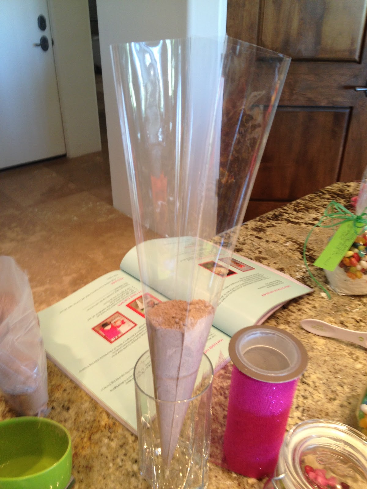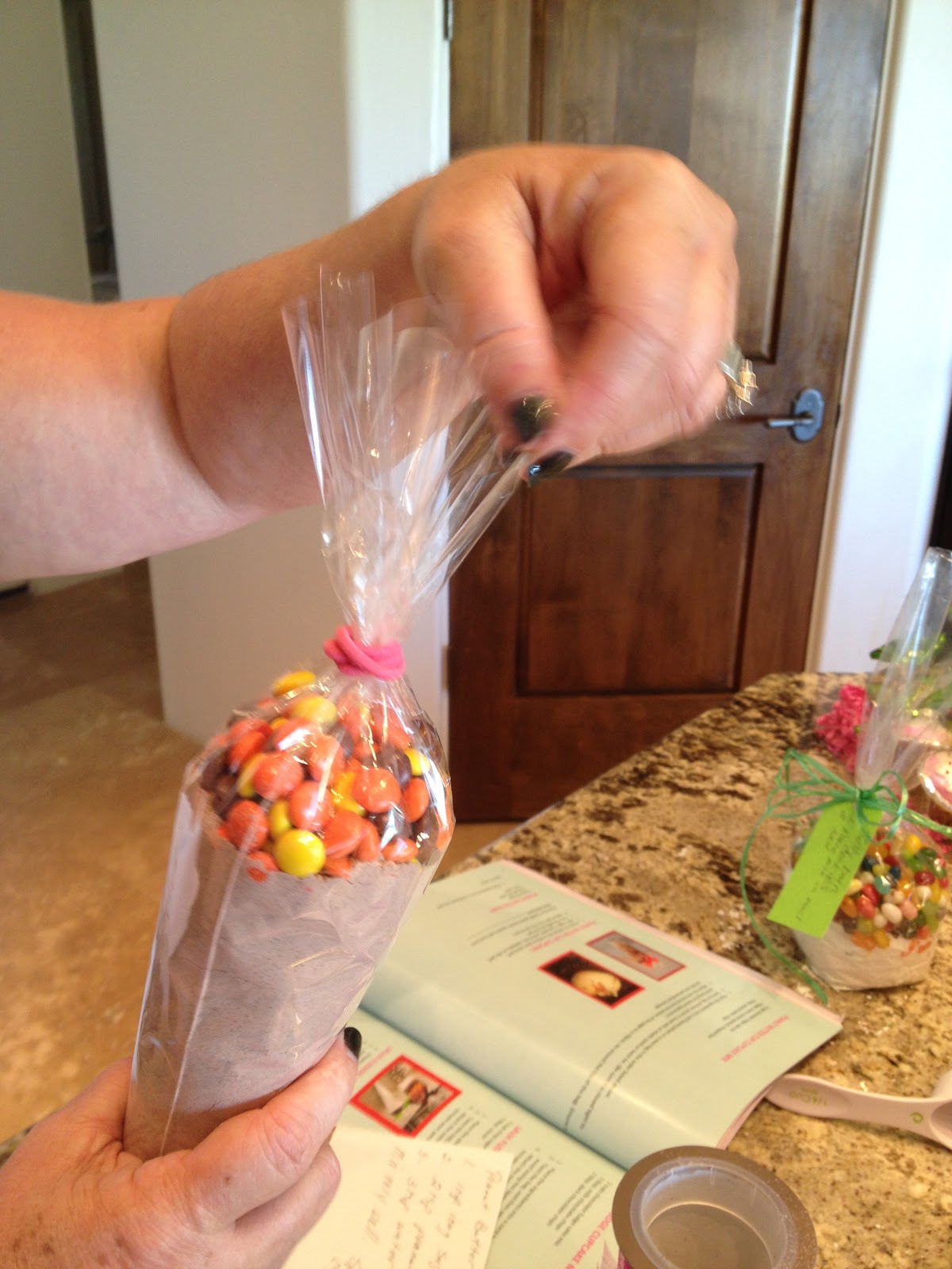 Here's our recipe for Peanut Butter Chocolate Cupcakes! You'll need: A tall glass, a cone bag, chocolate cupcake mix, Reese's Pieces candies, a rubberband, a ribbon and a tag.
