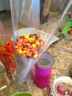 3. Top the cake mix with the Reese's Pieces candies.