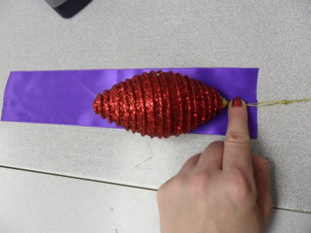 Step 3: Cut a 10 inch strand of 1-inch ribbon and lay underneath the top of your ornament perpendicular to the original piece of ribbon (as shown).