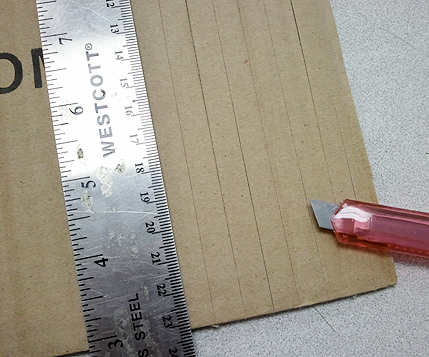 3. On the rectangle piece of cardboard use the knife and ruler to cut part way through the cardboard. Make a cut from the top to the bottom about every ¼ inch. Make cuts until the entire piece is scored. Try making a cylinder shape to see if any cuts should be made or fixed.