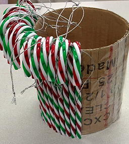 Wrap a ribbon around the middle of the candy canes. The final product of the base should look like this: